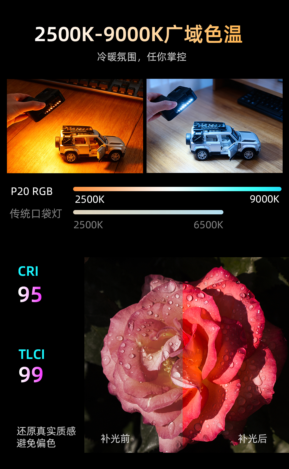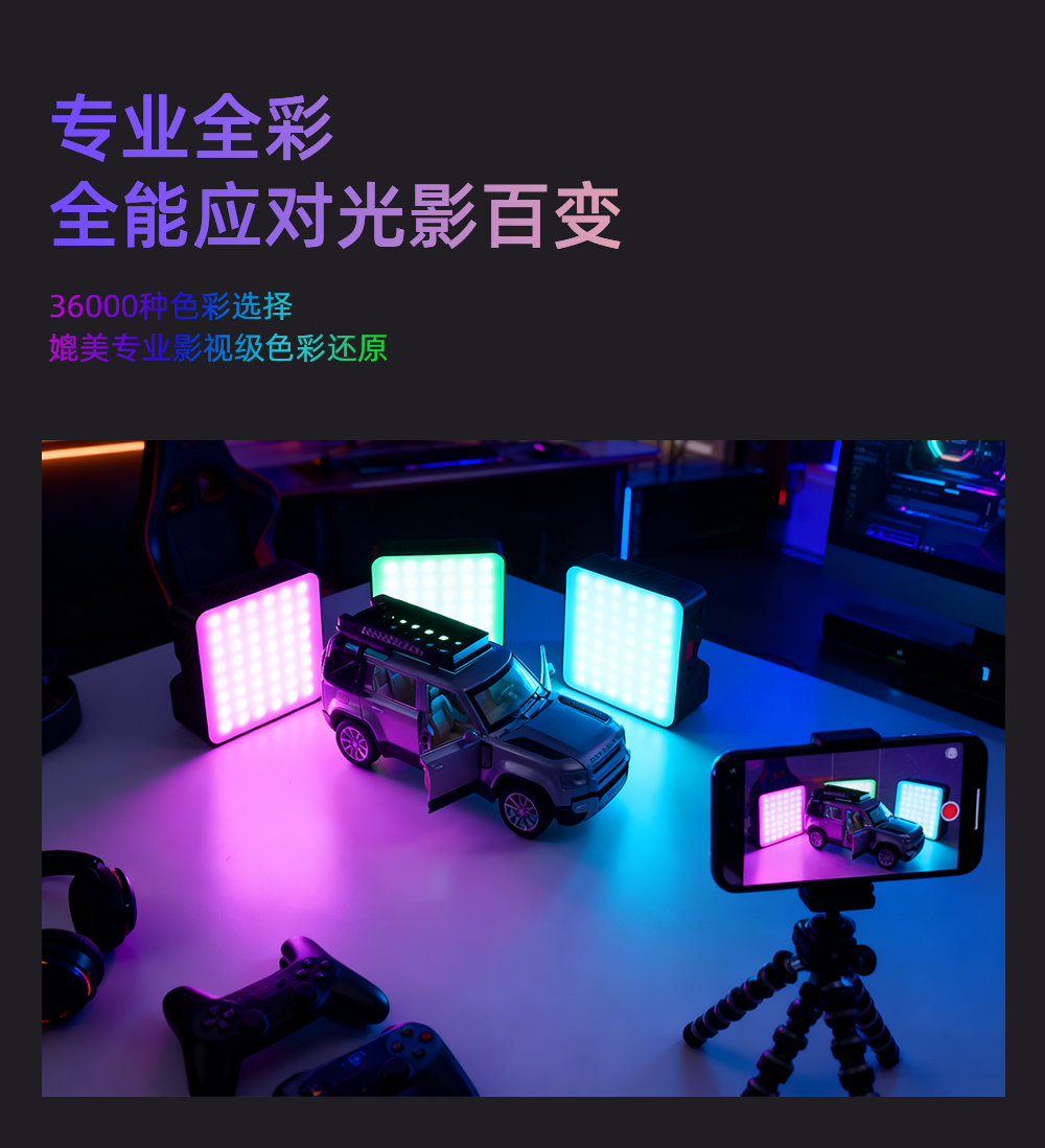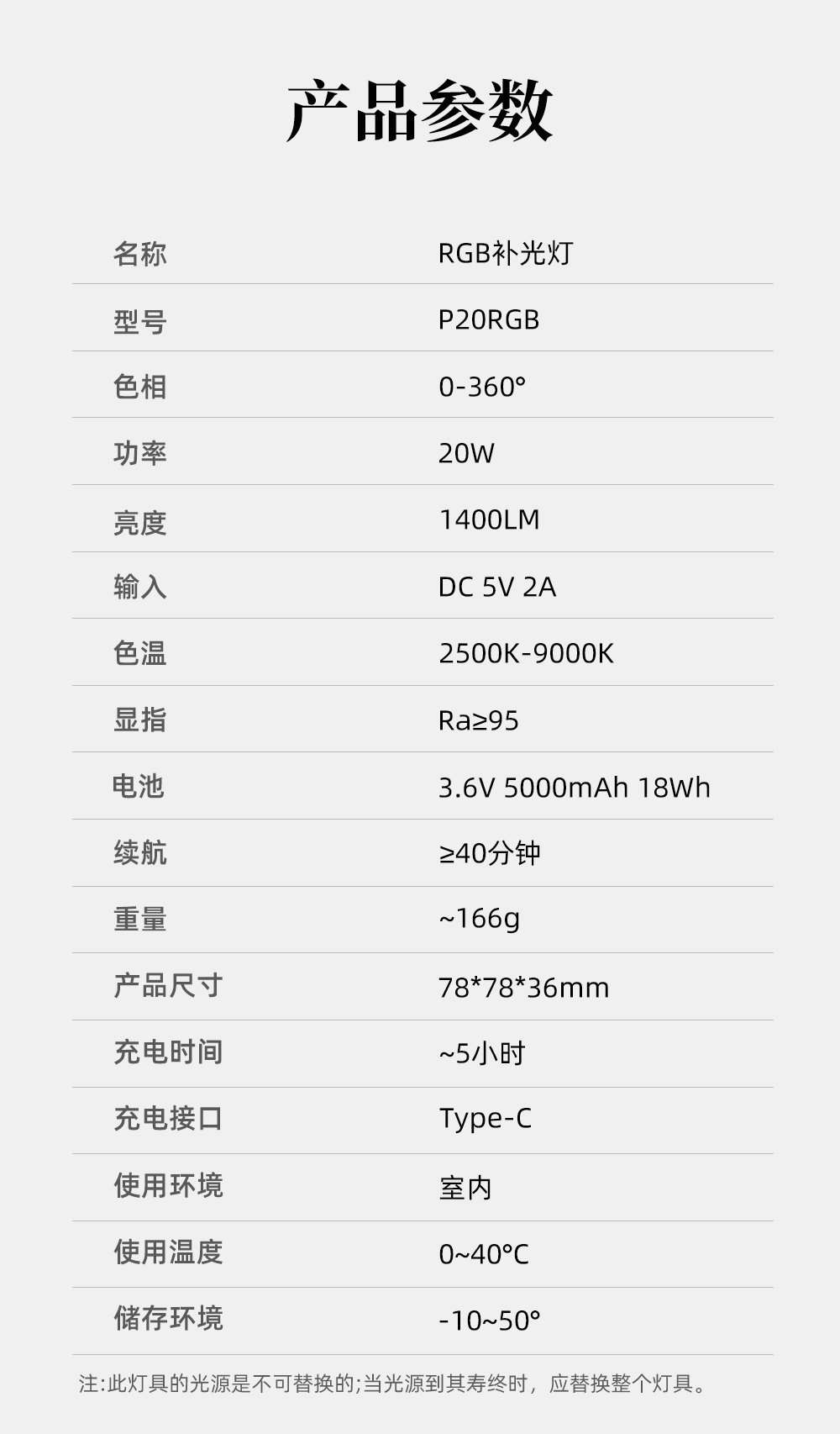 20W,36000彩色RGB便携口袋灯,内置电池,2500-9000K色温,20种场景模拟,静音风扇散热