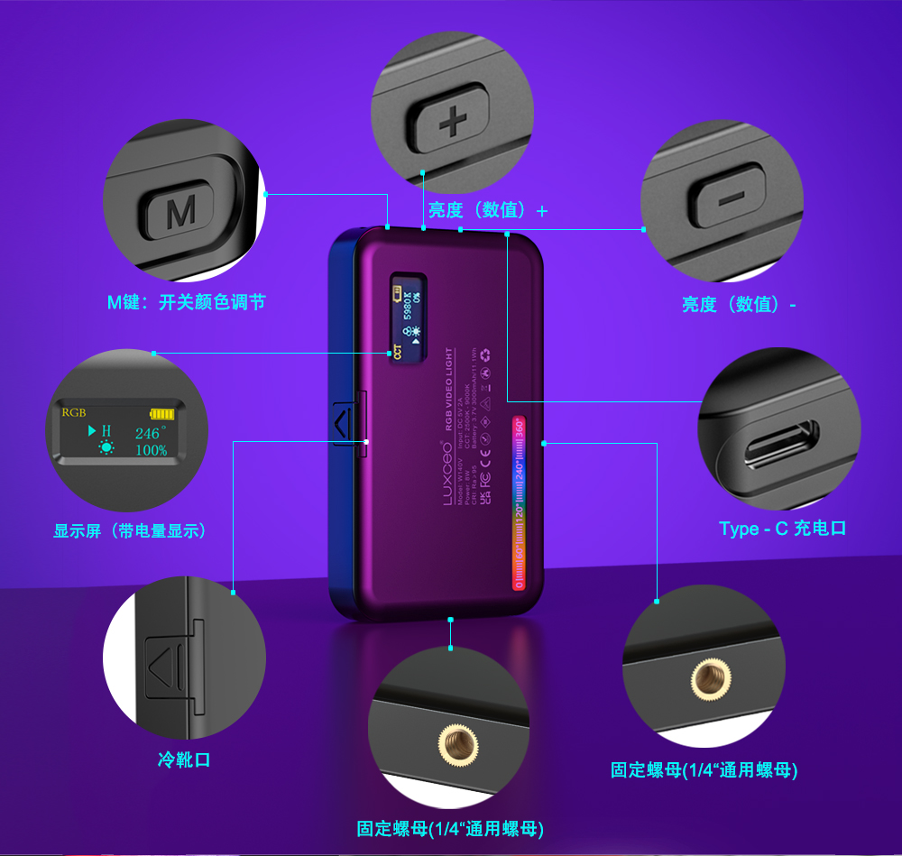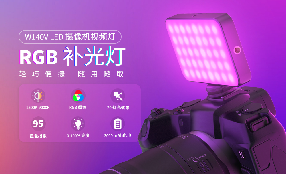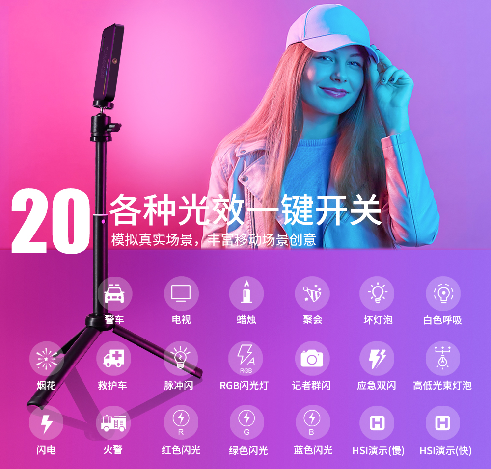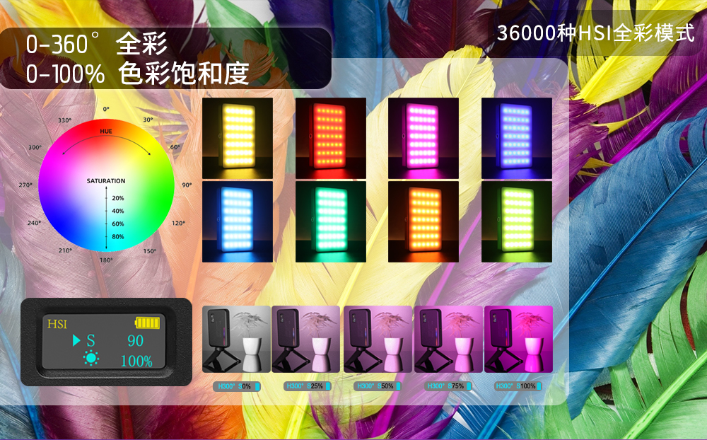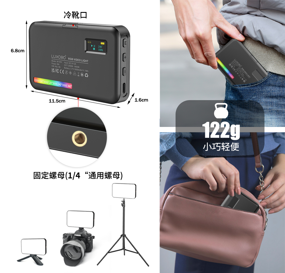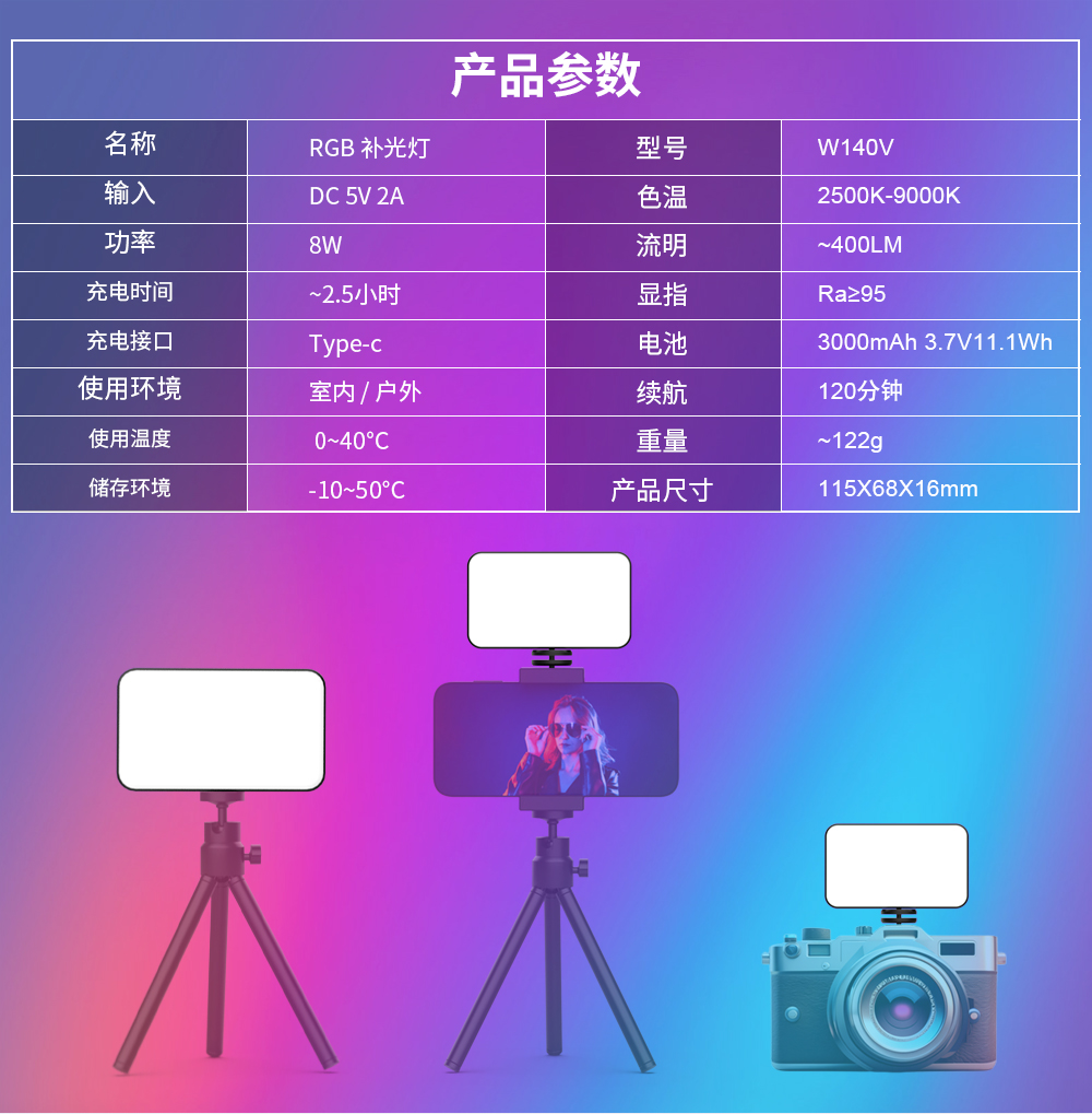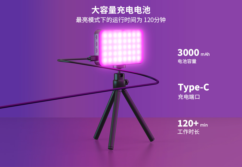 8W,36000彩色RGB便携口袋灯,内置电池,2500-9000K色温,20种场景模拟