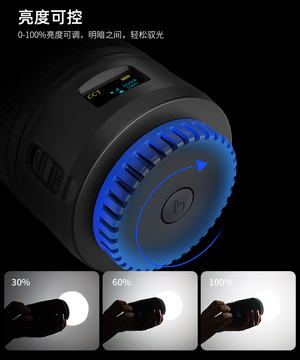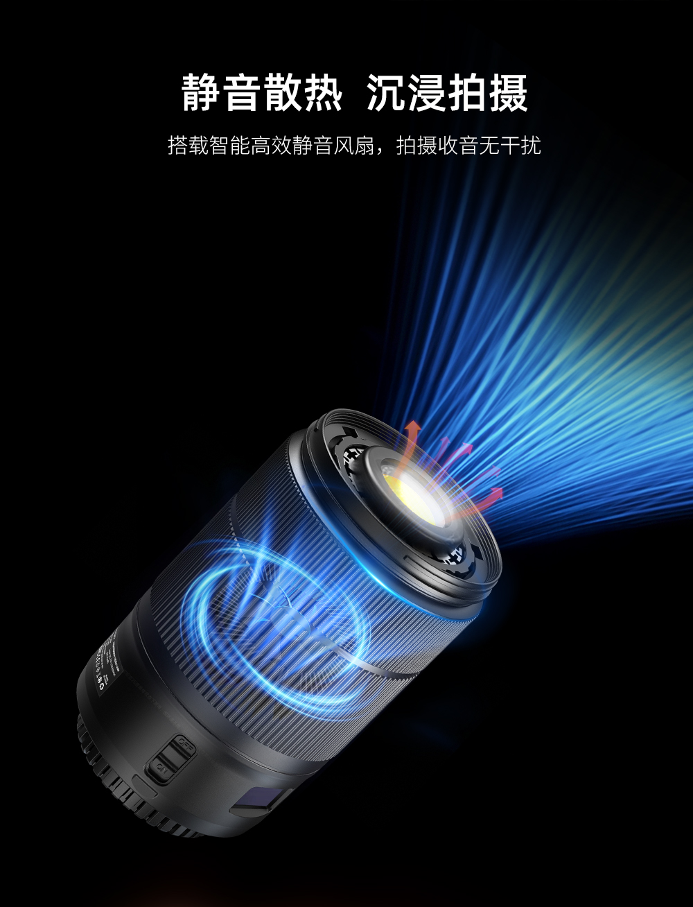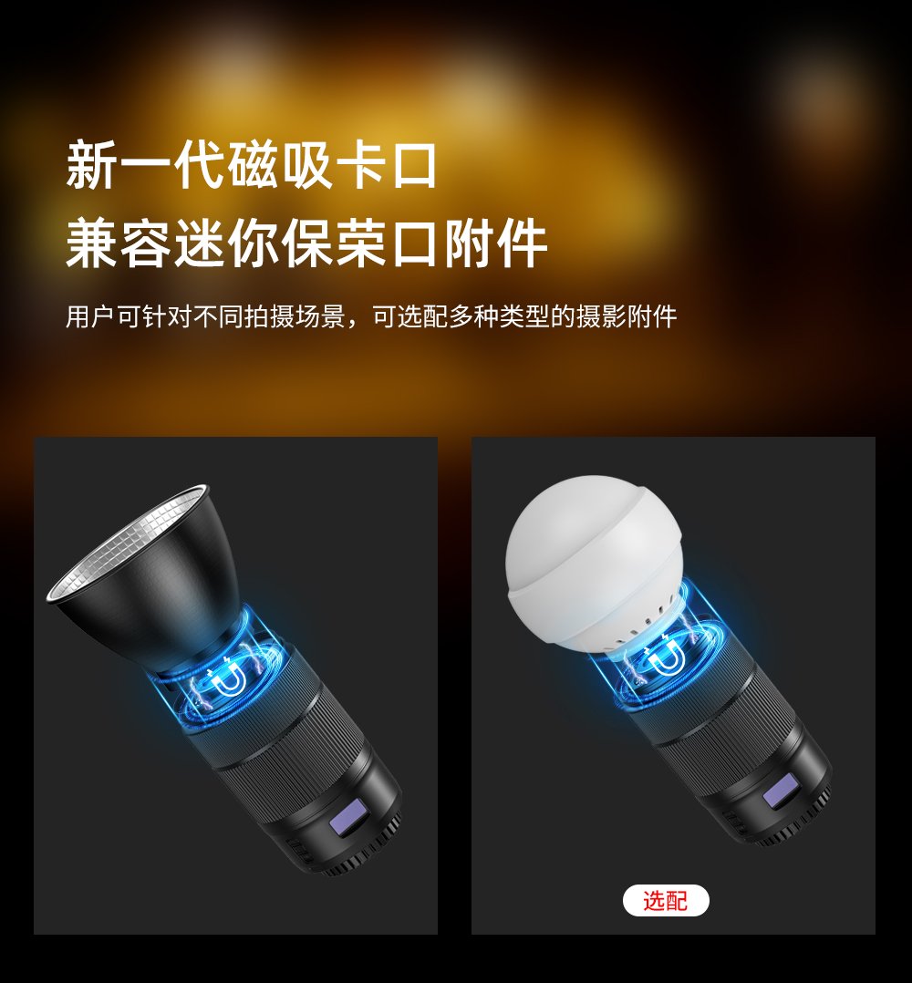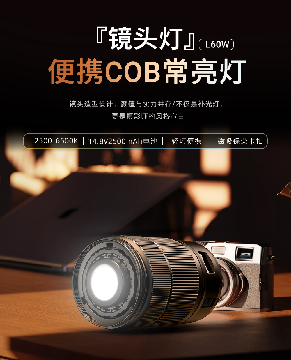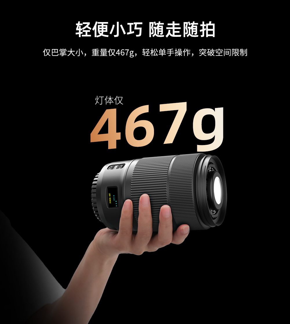 60W,酷似镜头外观、内置电池,双色温调节,静音风扇散热