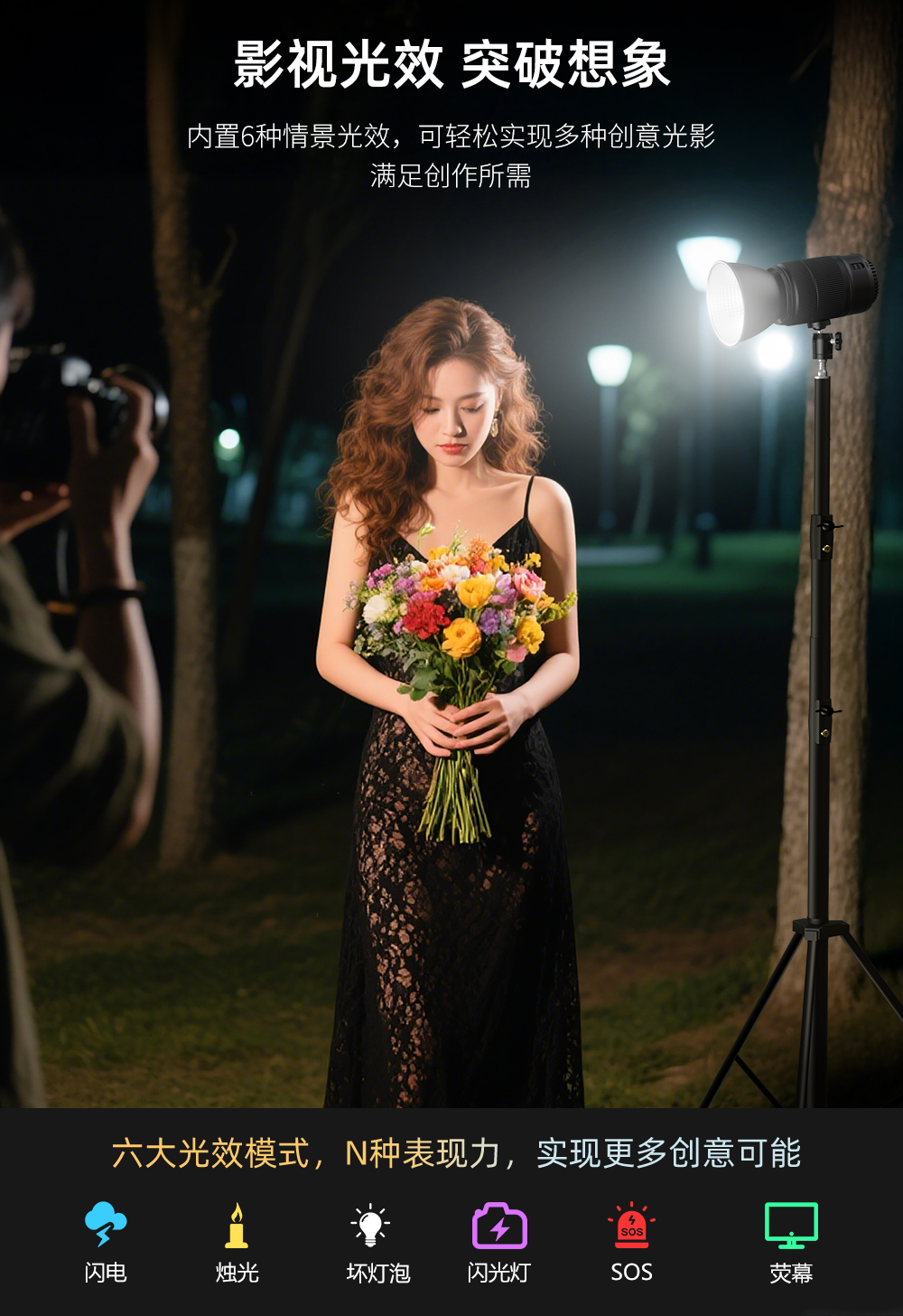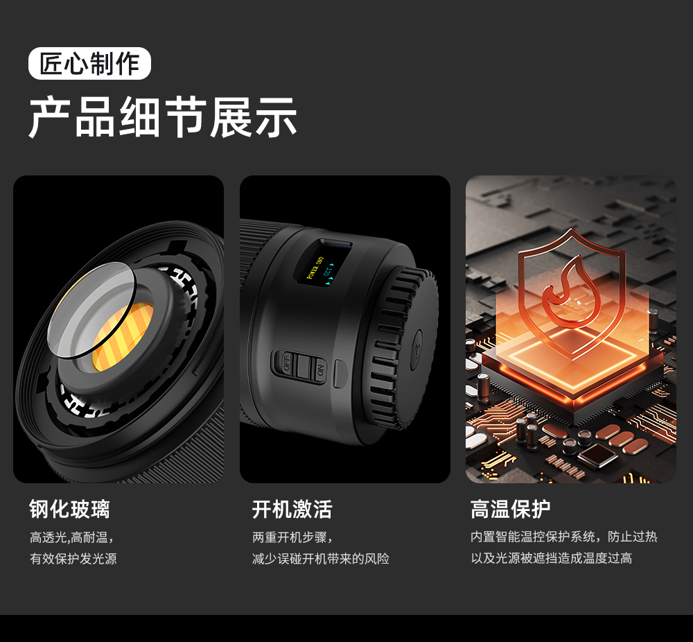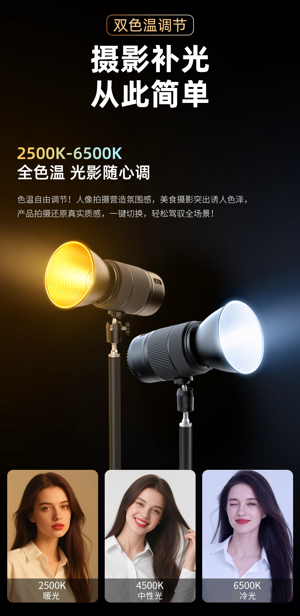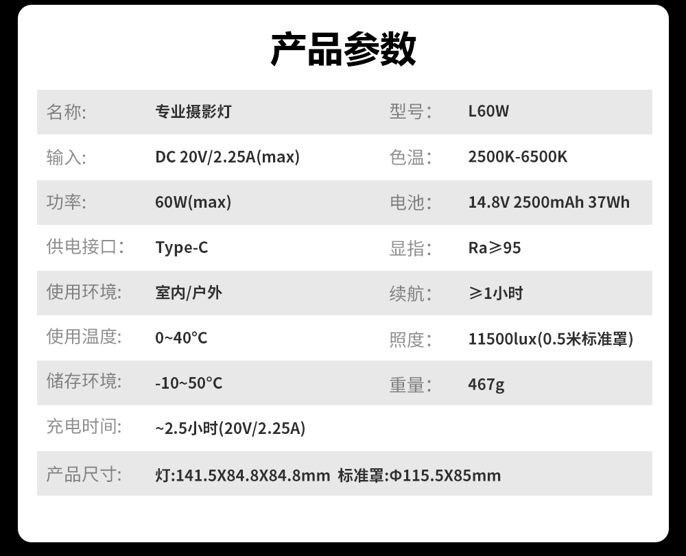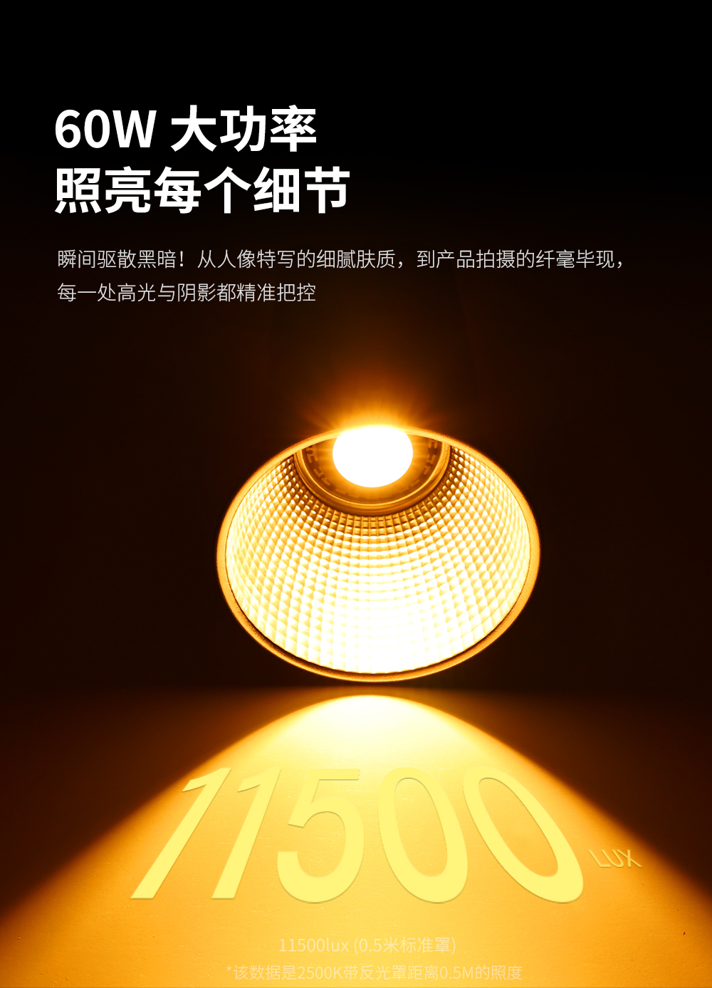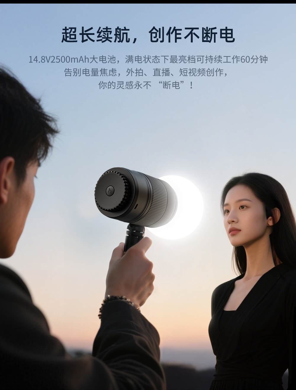 60W,酷似镜头外观、内置电池,双色温调节,静音风扇散热